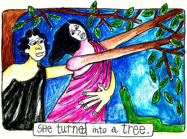 Daphne was a very beautiful nymph. Unfortunately, Apollo, with the help of Cupid’s arrow, had the hots for her. Daphne ran and called out to her dad, the river god Peneus, for help. Her dad turned Daphne into a laurel tree but that didn’t stop Apollo’s passion. He stroked her limbs and picked her leaves and declared that he would wear them in his hair. And from then on laurel crowns would be worn on the heads of the royal and the victorious. (Even now, in Italy, graduating university students wear wreaths of laurel on their heads).