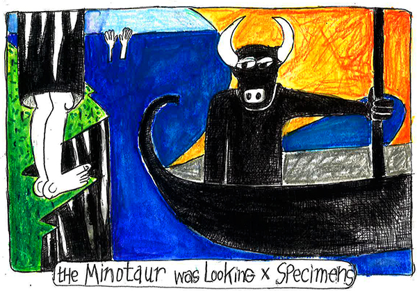 One morning Ariadne was scanning the sea when she saw a boat sailing towards the island bringing with it news that would shock her. The Minotaur had not been killed after all by Theseus, just neutered. Now a botanist and vegan, the Minotaur cruised the islands looking for plant specimens. That’s how he arrived on the island where Ariadne was living, an island inhabited only by women. These women had worked hard to have a place of their own where they weren’t intimidated or imposed upon by men. Thus they were not pleased about having a mutated male bull on their island of refuge. However, Hypatia said, “we have no quarrel with men who have no quarrel with us.”