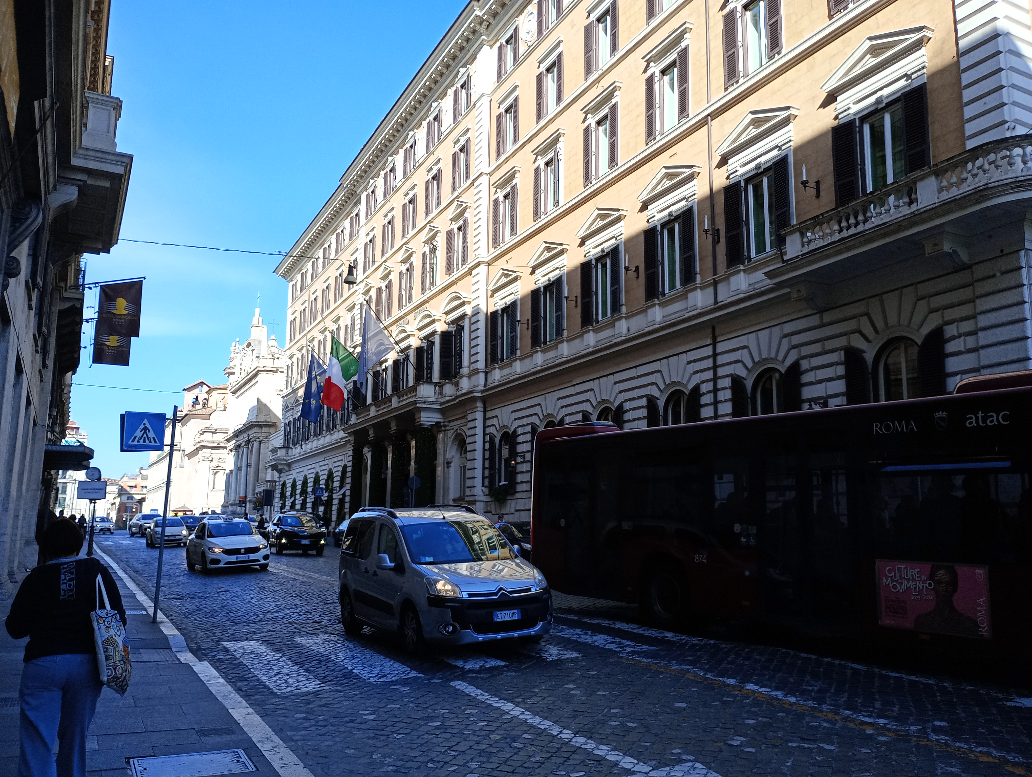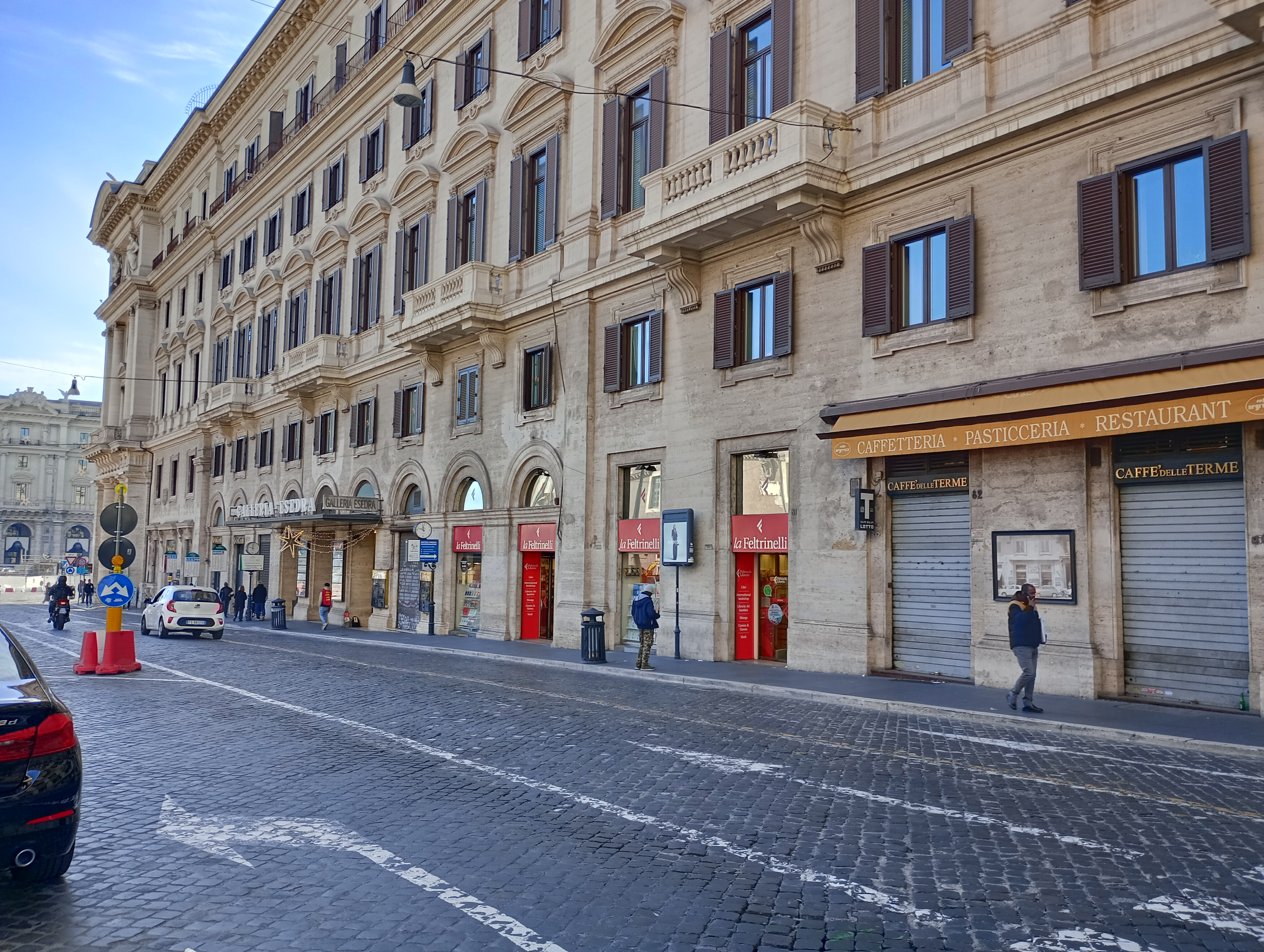 Just further down the block is the Grand Hotel (the entrance is where the flags are waving). It faces the now defunct Feltrinelli’s International Bookstore.