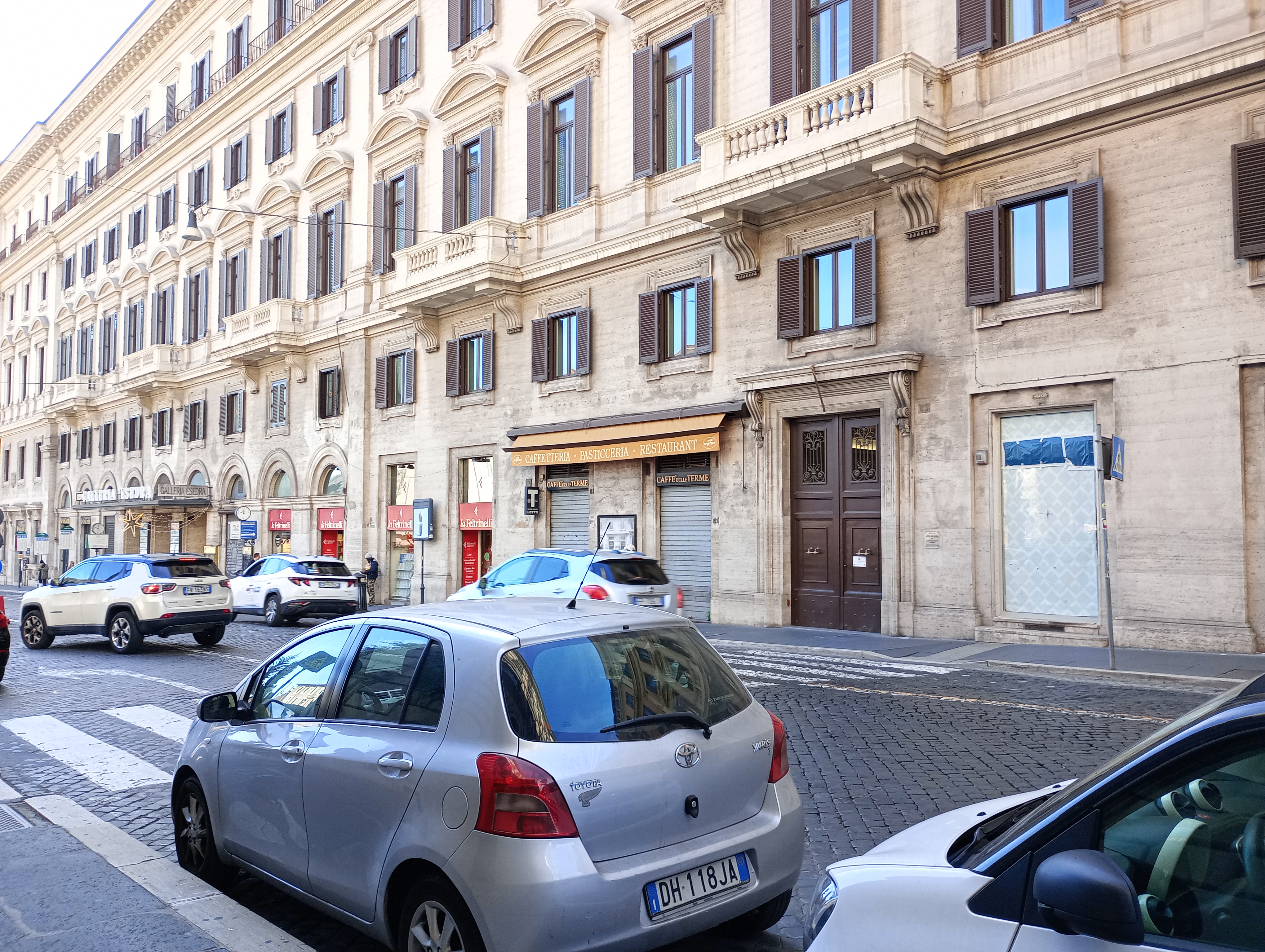 The big display windows of the now defunct Feltrinelli’s International bookstore are covered with paper to hide the emptiness within. What’s left of Feltrinelli’s is further down the block still on the right where the red signs are.