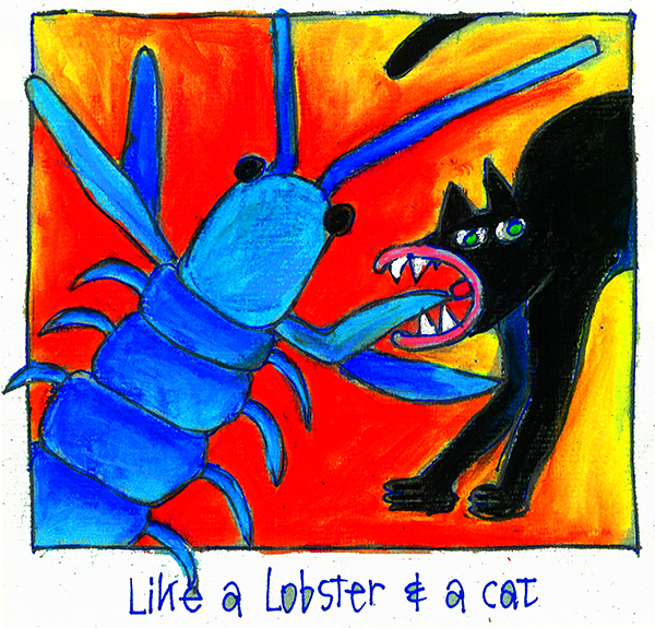 Picasso painted various lobsters including one of a blue lobster with a cat. The cat is afraid and hisses.