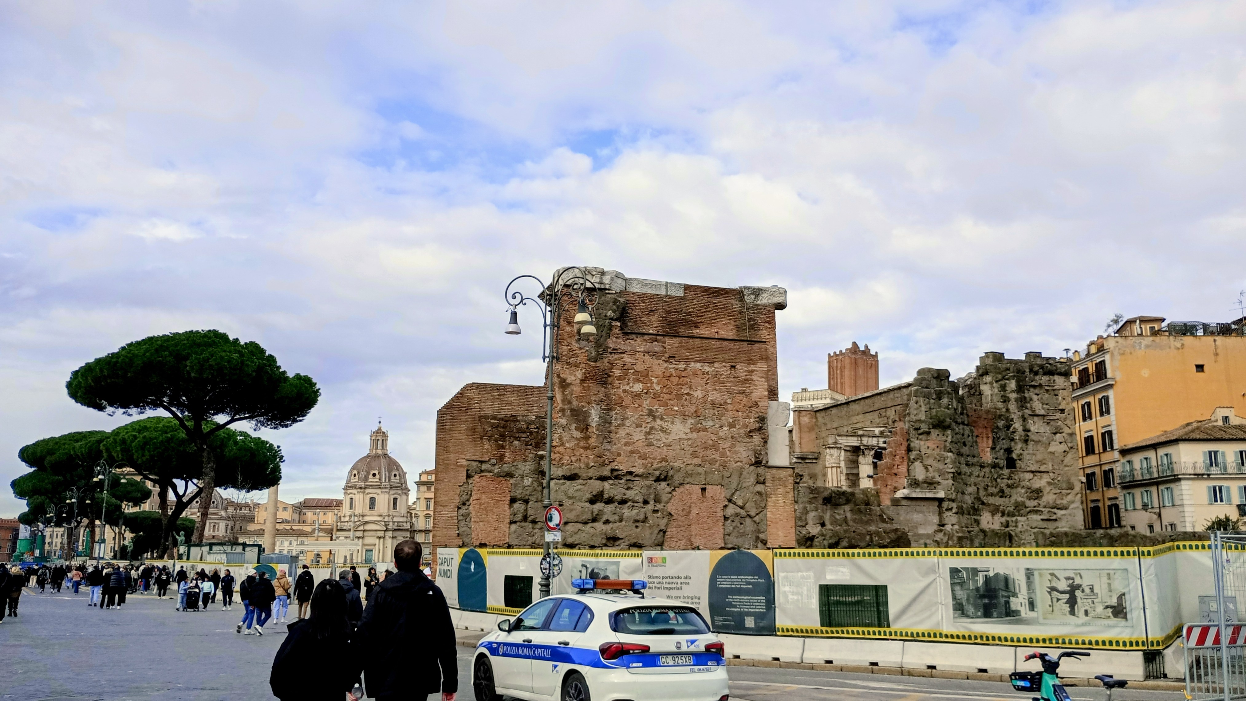 Beneath the wall is via dei Fori Imperiali (Imperial Fora). The fori are a series of monumenta squares and their buildings. they are all in the same area facing via dei Fori Imperiali. The forums are: Forum of Caesar (46 BC), Forum of Augustus (2 BC), Forum of Nerva (81-96 AD), Forum of Trajan (113 AD), yhr latter being built using the spoils from Dacia.