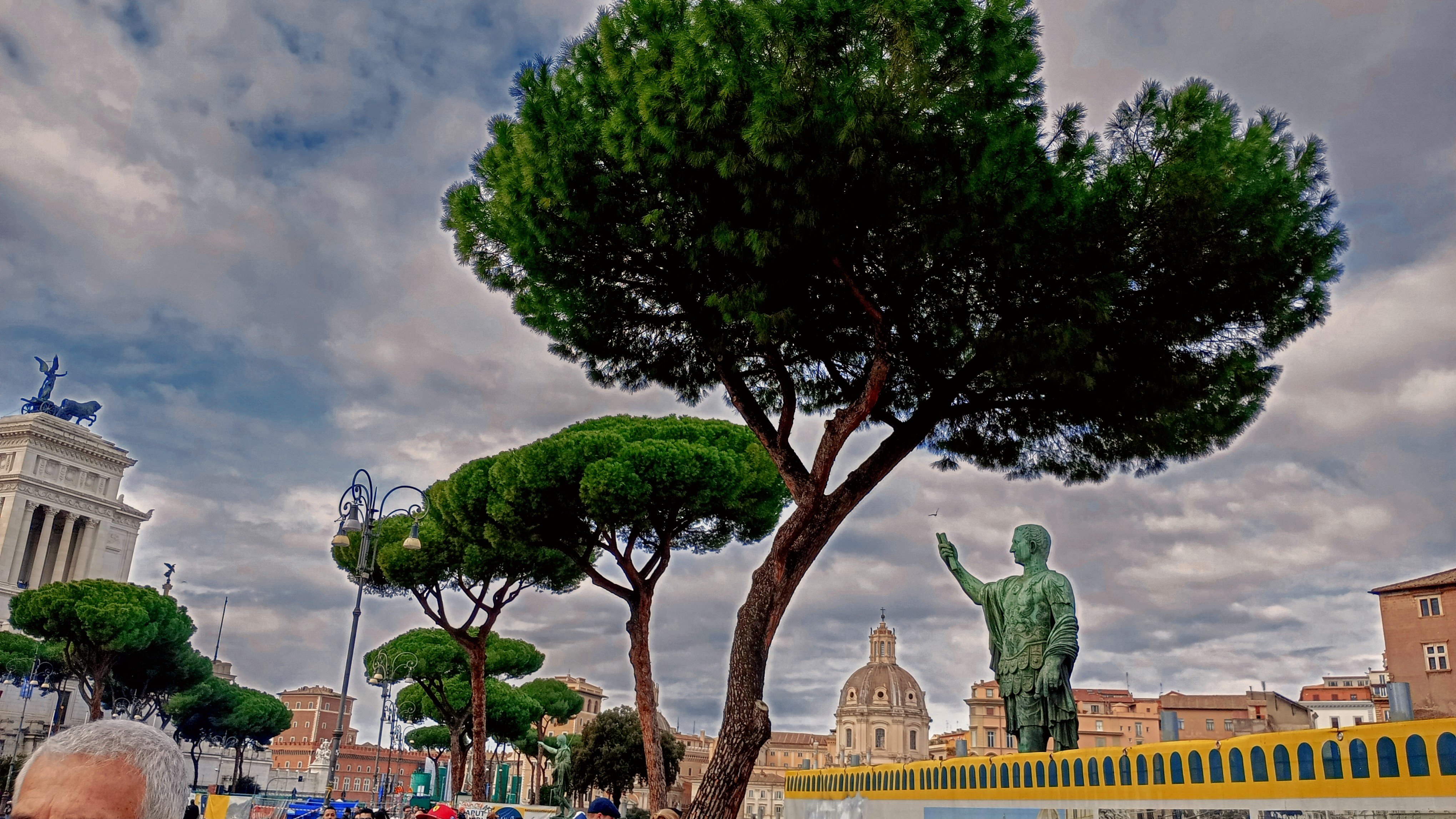 In the background are two cupolas as well as the top of the Trajan Column. One cupola is that of Santa Maria di Loreto al Foro Traiano (1585). And I believe the other cupola to be that of Santissimo Nome di Maria al Foro Traiano (1751).