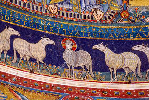 Medieval Sheep Mosaics by Pietro Cavallini in the Church or Bailica of Santa Maria in Trastevere Rome Italy. The sheep represent the twelve Apostles