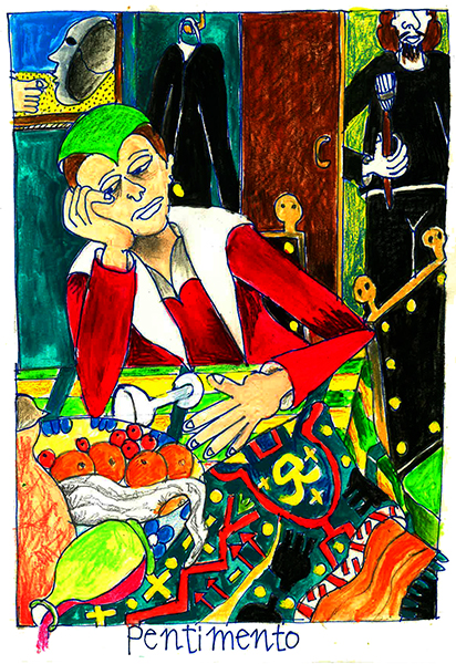 Artists often change their mind about the composition of their paintings and try to obliterate the now unwanted part by overpainting it away. This change of mind by the artist is known as “pentimento” from the Italian verb “pentirsi” meaning “to repent”.