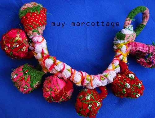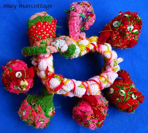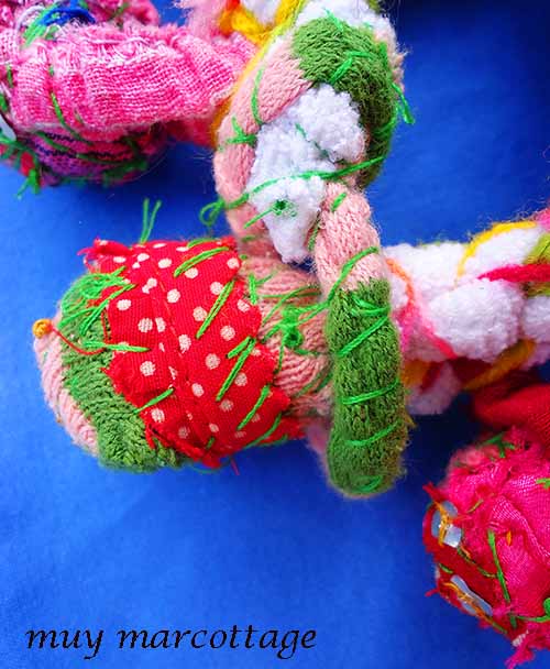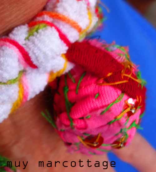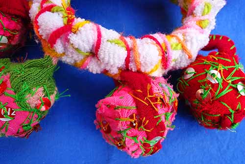 The name of this bracelet is “Basorexia”. It’s made from fabric scraps. The base was made by crocheting a shredded t-shirt whereas the “charms” were made by fabric scraps sewn together to create giant beads. The beads are embellished with stitching and paillettes/sequins made from soda cans.